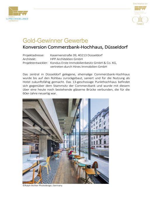 Gold vergab die Jury in der Kategorie Gewerbe für die Konversion des ehemaligen Commerzbank-Hochhauses in Düsseldorf.