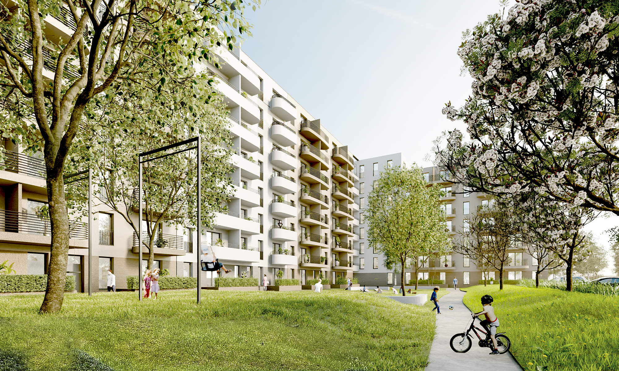 Die von der Implenia Hochbau Zweigniederlassung Berlin, gemeinsam mit Baumschlager Eberle Architekten, Berlin, geplanten Wohnflächen erfüllen in Bezug auf die technische Ausstattung alle modernen Anforderungen. Das Gebäude wird mit Fernwärme versorgt. Die Warmwasserbereitung erfolgt zentral im Durchflussprinzip. Die Wohnraumlüftung wird mit dezentralen Abluftgeräten und einer Nachströmung über Fensterfalzlüfter realisiert. Die Immobilie wird im KfW55-Standard errichtet. Für die Regenwasserbewirtschaftung wird eine geschlossene Rigole auf dem Grundstück verortet.