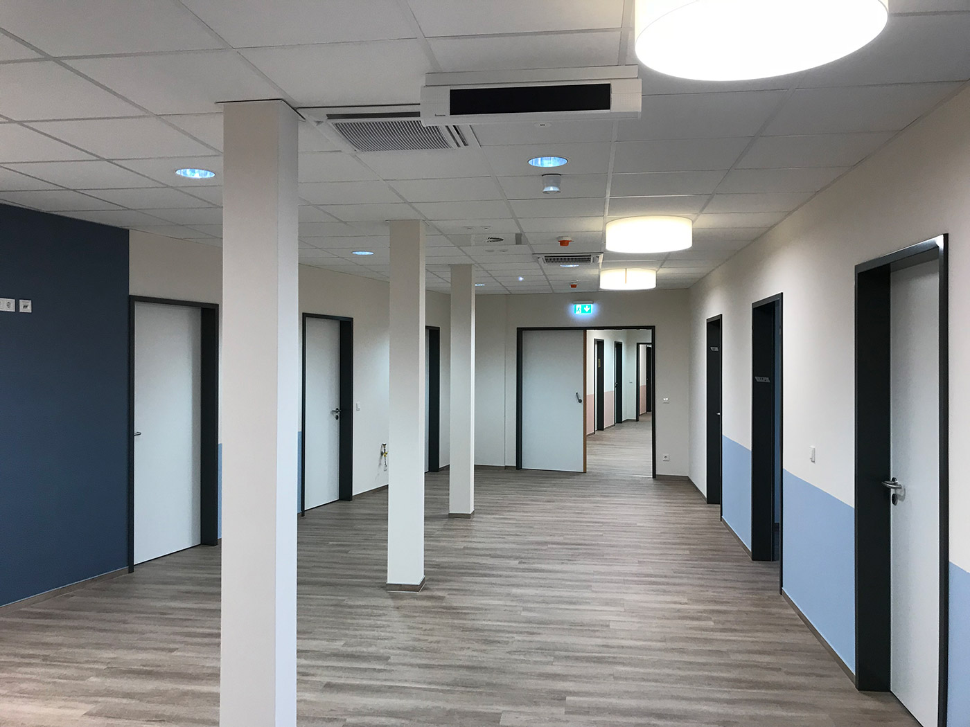 - Anpassung sicherheitstechnischer Einrichtungen wie SAA, BMA und auf die neue Nutzung sowie Integration von Neuanlagen wie Patientenruf und DECT. Anpassung der vorhandenen Sprinkleranlage auf die neue Ausbau- und Nutzungssituation